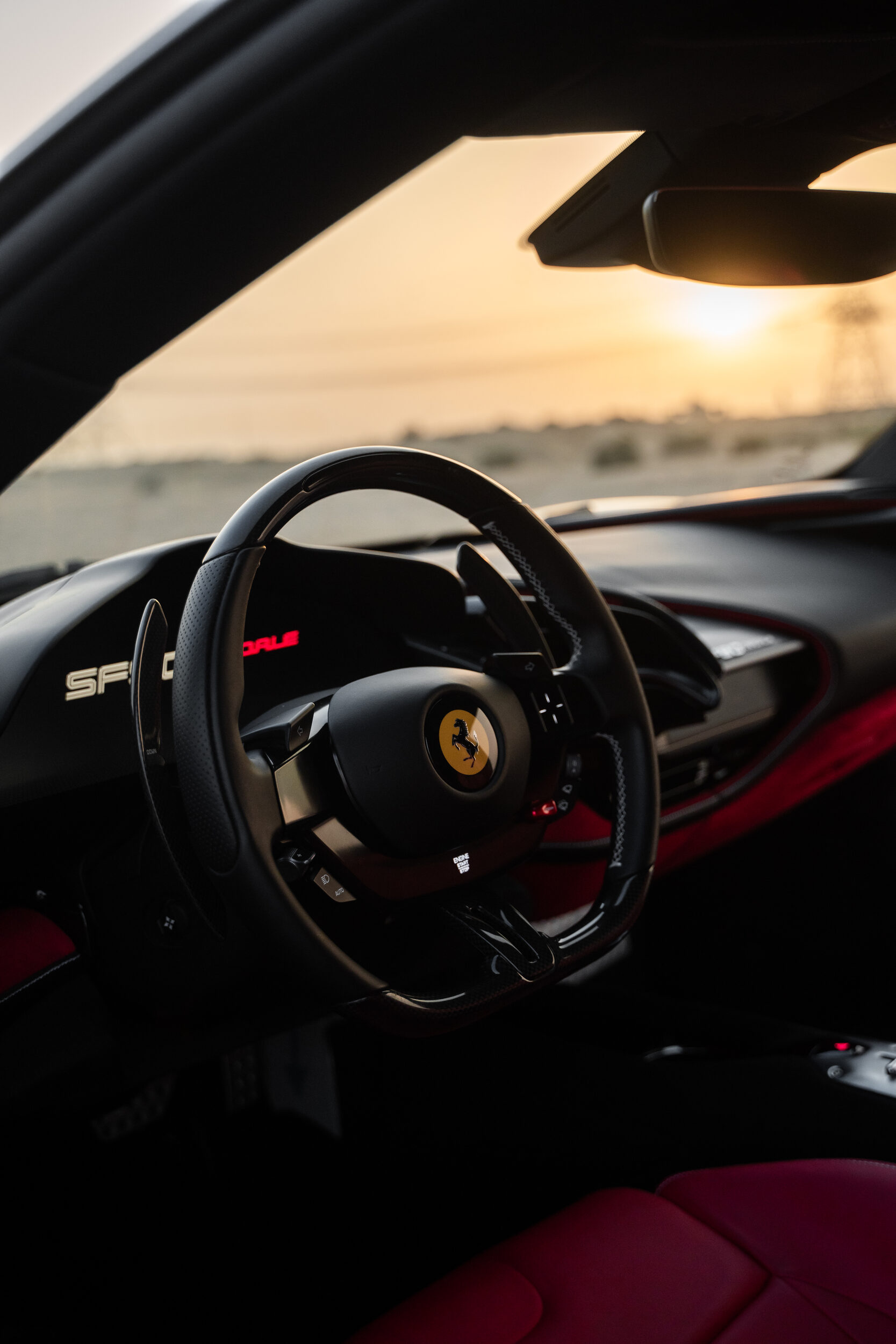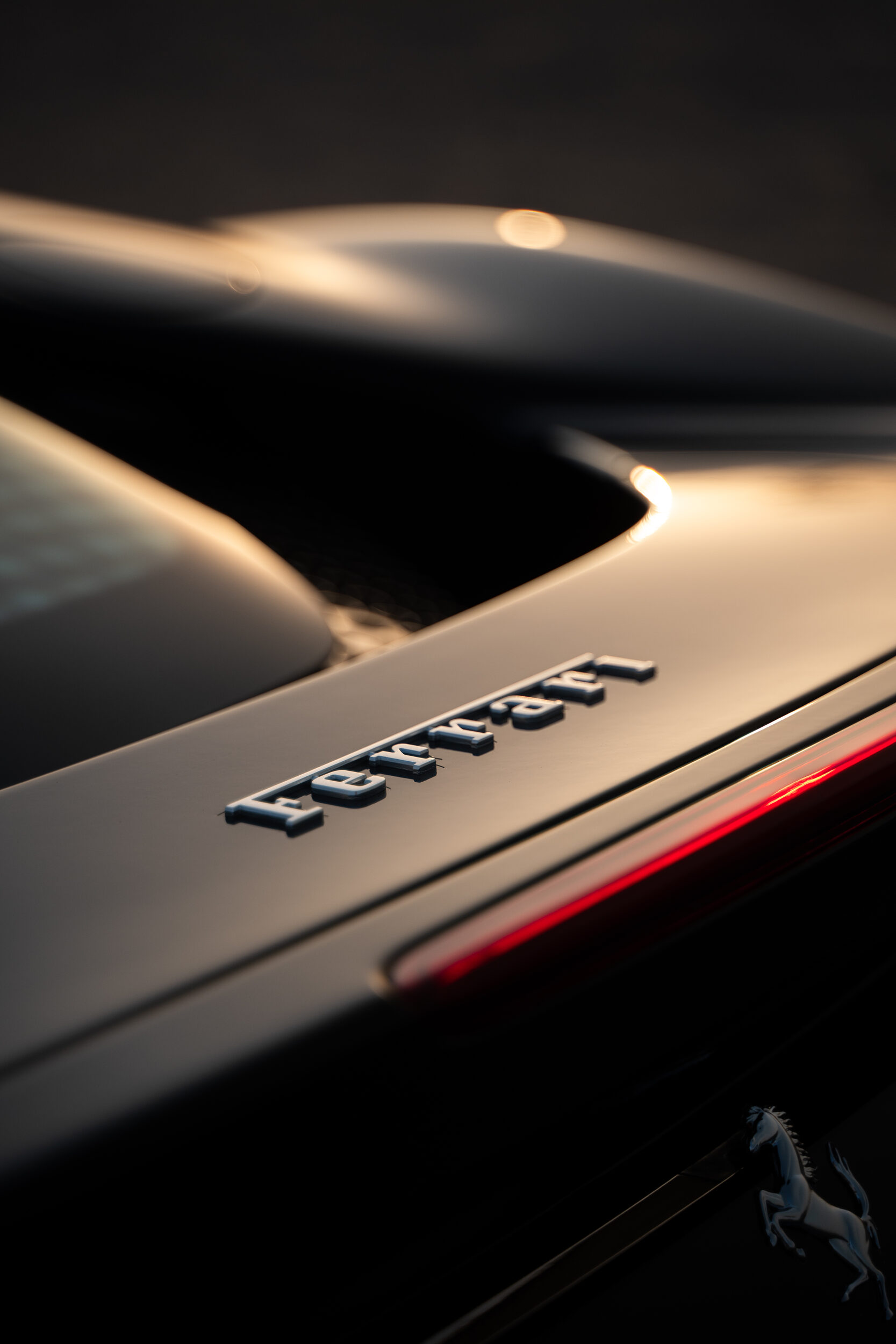 Schwarzer Ferrari in der Wüste. Bewegungsunschärfe der Felgen und das Cavallino Rampante in voller Fahrt.